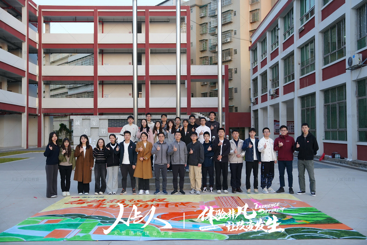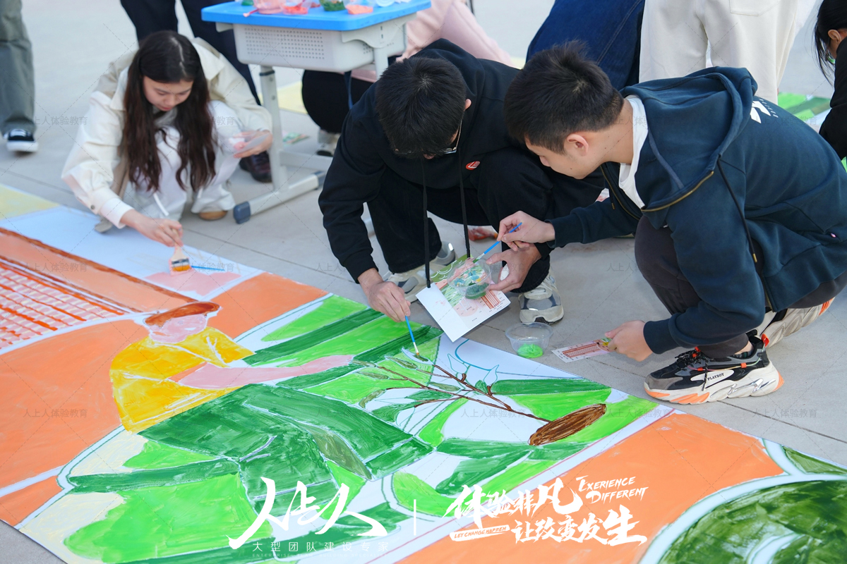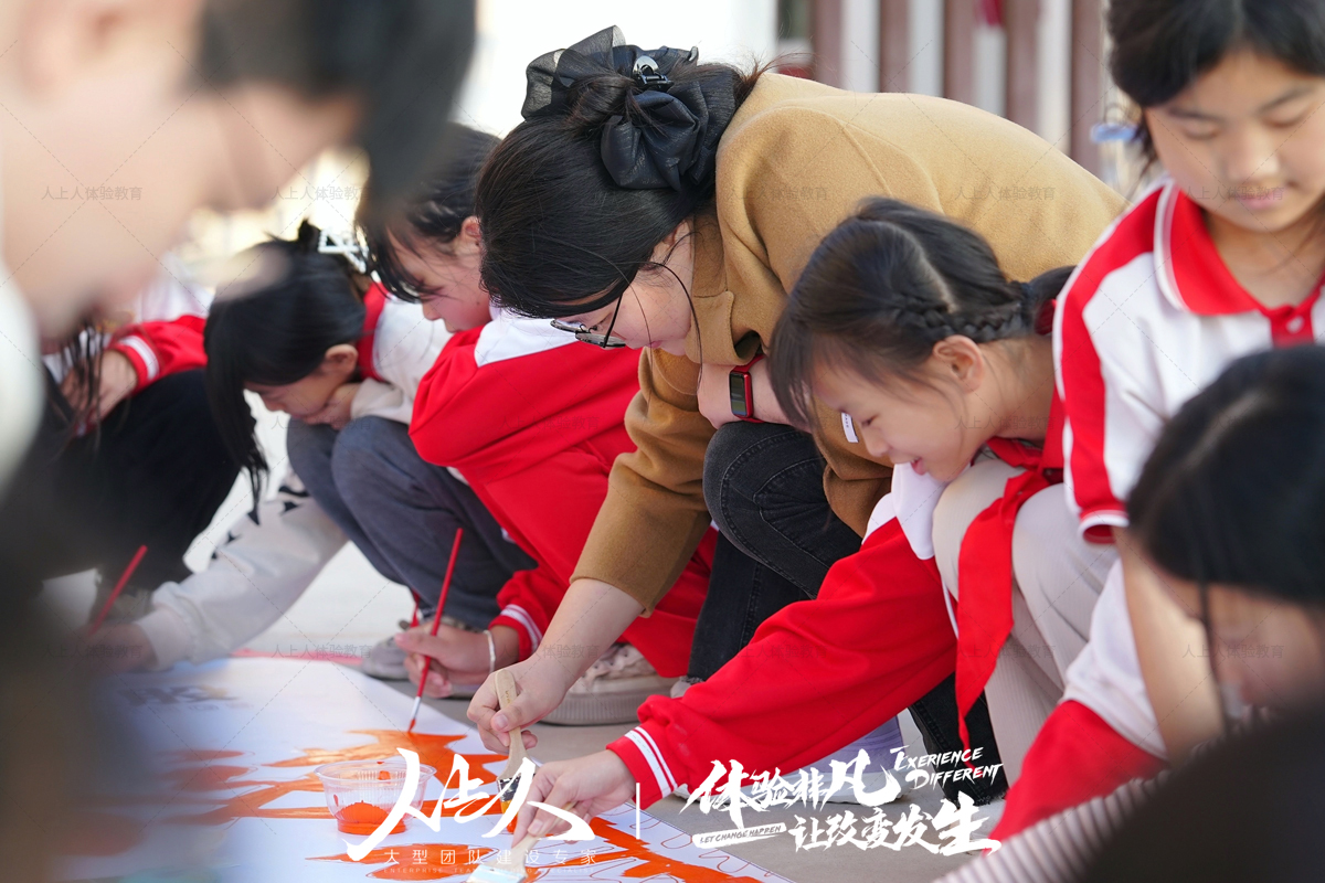一幅巨大的画布在校园中徐徐展开,员工们和孩子们携手站在画布前,拿起画笔,共同勾勒出心中的中国梦。