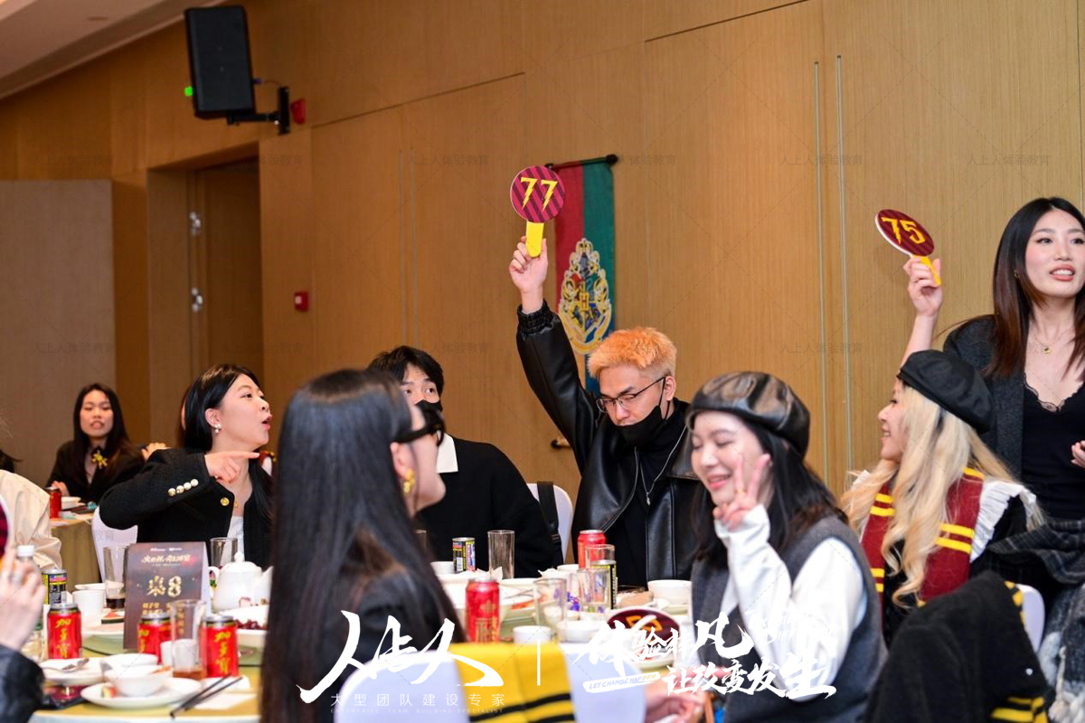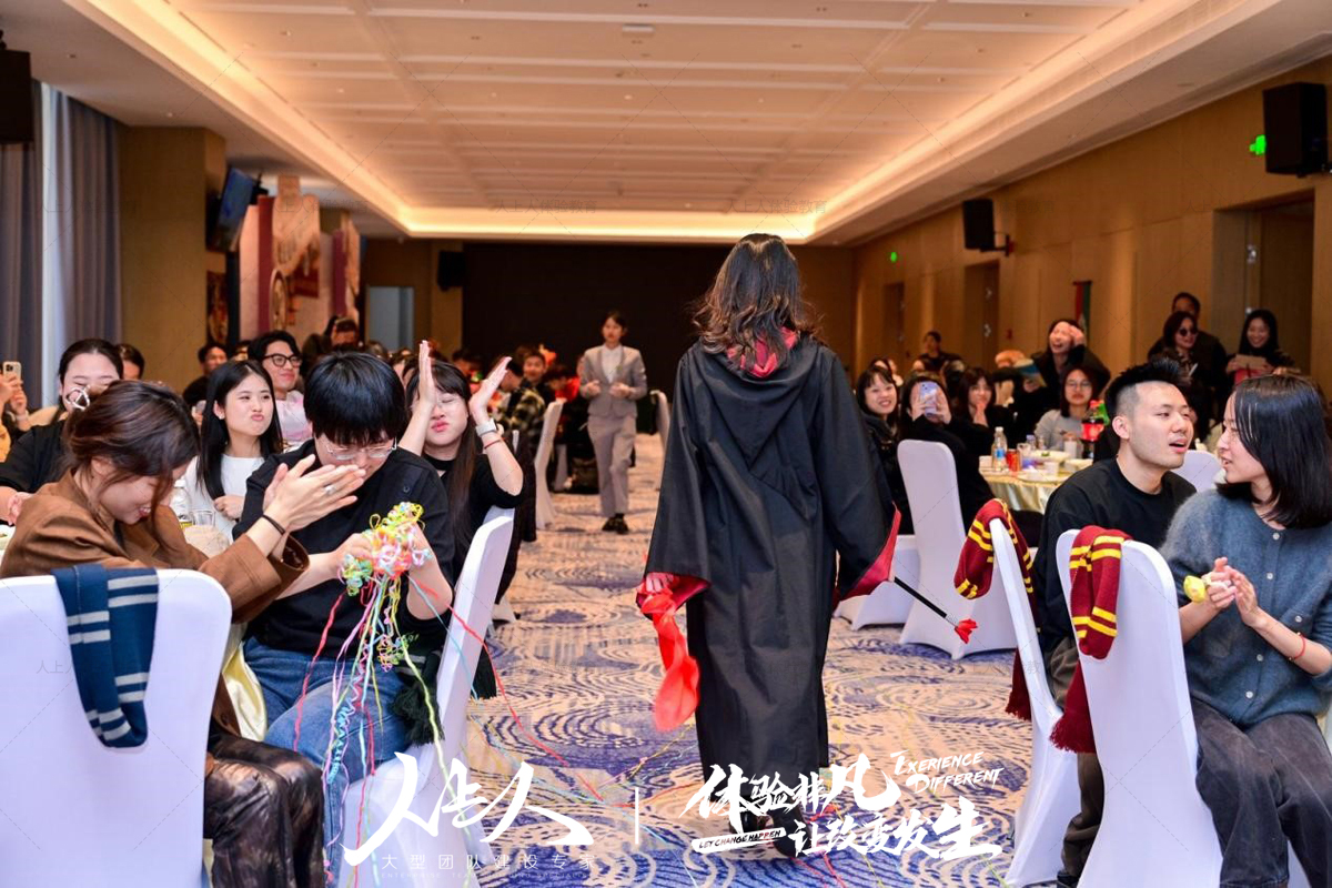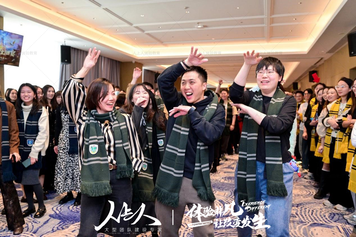 抵达后,开启分院仪式,现场气氛热烈非凡,员工们领取到属于各自学院的围巾,格兰芬多的勇敢红、斯莱特林的狡黠绿、赫奇帕奇的温暖黄、拉文克劳的智慧蓝,瞬间让大家沉浸在魔法学院的氛围之中。